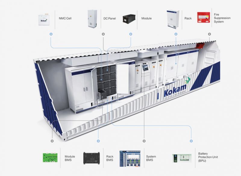 The preliminary design given its smaller utility scale is proposing to use the Kokam battery energy storage system as its design example and further details can be read here. A picture real world example is shown below.